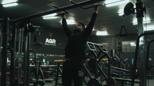 - Baja la barra de manera controlada hasta que toque ligeramente el pecho.