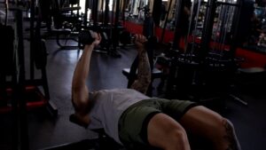 - Acuéstate en un banco plano con una mancuerna en cada mano, sosteniéndolas sobre tu pecho con los brazos extendidos y las palmas de las manos mirando hacia arriba.